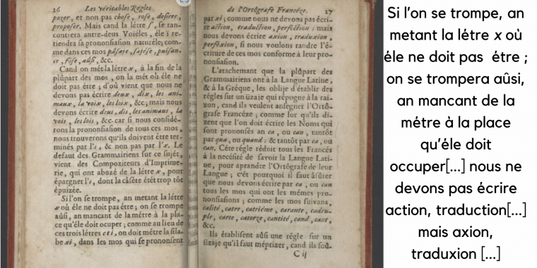 À l’époque où se créait l’académie française, avec le dessin d’opérer la fixation d’une orthographe qui est encore en grande partie la nôtre, en 1668, Louis de Lesclache eut l’idée saugrenue de publier Les Véritables règles de l’ortografe francèze, ou l’Art d’aprandre an peu de tams à écrire côrectemant, Disponible ici sur Gallica BnF. Il s’agissait, à ses yeux, de démocratiser l’écriture (difficile à populariser cause des règles complexes de l’orthographe française).