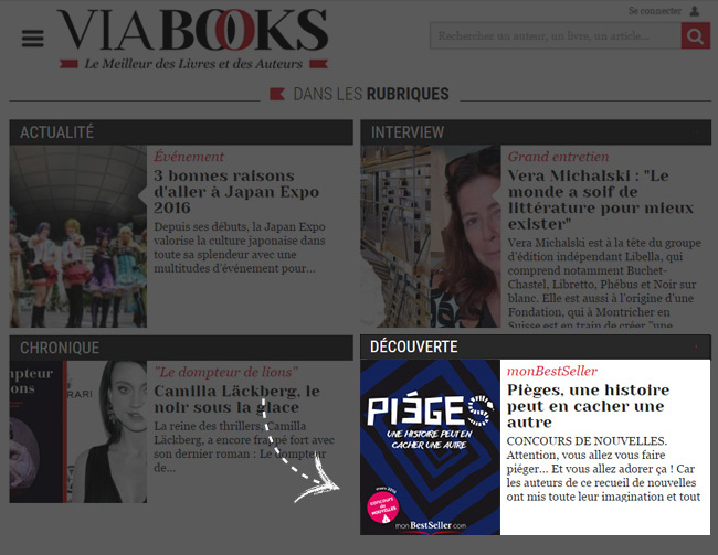 Nouveau : Viabooks est un web magazine de critique littéraire qui traite des dernières sorties de romans et des nouveaux phénomènes littéraires. Viabooks ouvre ses espaces en exclusivité à monBestSeller.